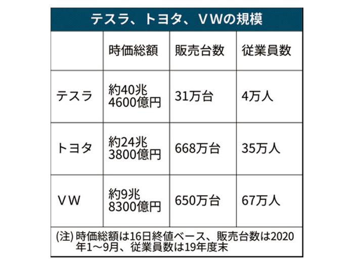 テスラが時価総額でトヨタ自動車を上回り、業界最大となったのが7月。販売台数ではトヨタとVWはそれぞれテスラの20倍ほどだが、時価総額は2社合計でもかなわない。トヨタ自動車の豊田章男社長も「株式市場での評価は完全に負けている」としている。