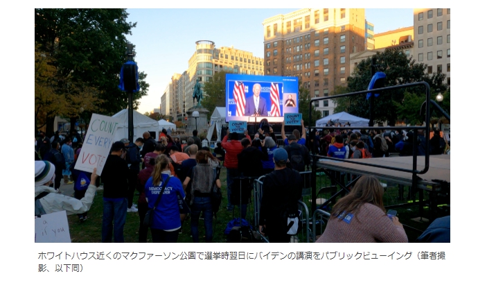 ホワイトハウス近くのマクファーソン公園で選挙時翌日にバイデンの講演をパブリックビューイング(筆者撮影、以下同)
