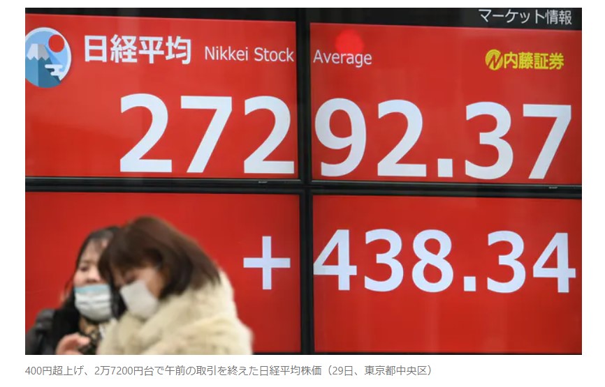 『29日午前の東京株式市場で日経平均株価は大幅に続伸し、前日比438円34銭(1.63%)高の2万7292円37銭で前場を終えた。取引時間中として1990年8月以来、約30年4カ月ぶりの高値を付けた。米追加経済対策の成立が引き続き安心材料となり、短期筋の先物買いが主導する形で上昇が加速した。