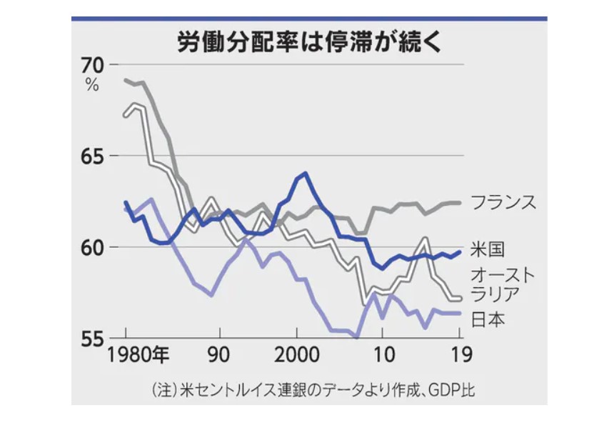 21世紀は大量雇用が不要なデジタル経済に軸足が移り、企業が生む利益と労働者への配分は同じベクトルとはならない。国際労働機関(ILO)によると、17年の世界全体の労働分配率は51.4%と04年から2.3ポイント低下。労働者に回る富は限られ、経済のダイナミズムが失われつつある。