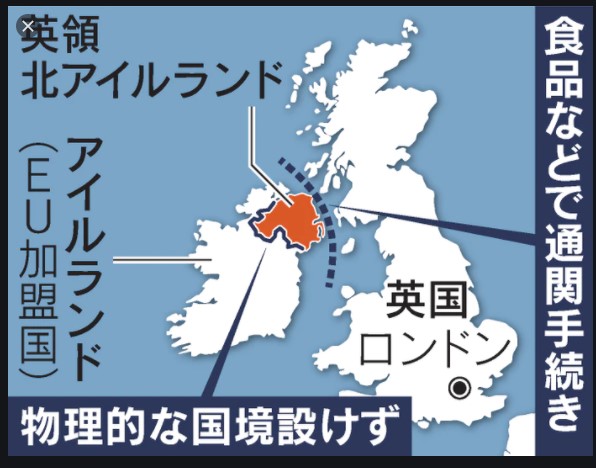 ※ すると、アイルランド⇔英領北アイルランド(及び、英国本土)間の物流は、EU加盟国どうしのものじゃ無くなったわけだ…。