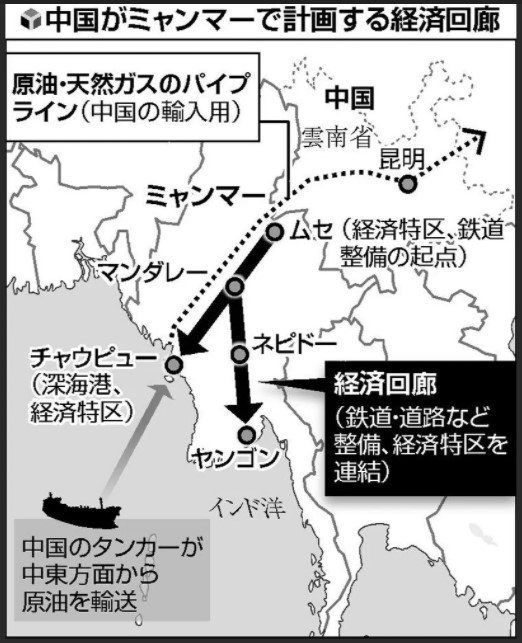 広域経済圏構想「一帯一路」を受け入れて「中国・ミャンマー経済回廊」の整備に合意。チャオピューでの大型港湾開発のほか、政変が起きる3週間前には、旧軍政が葬ったはずの鉄道の事業化再調査の覚書まで締結していた。