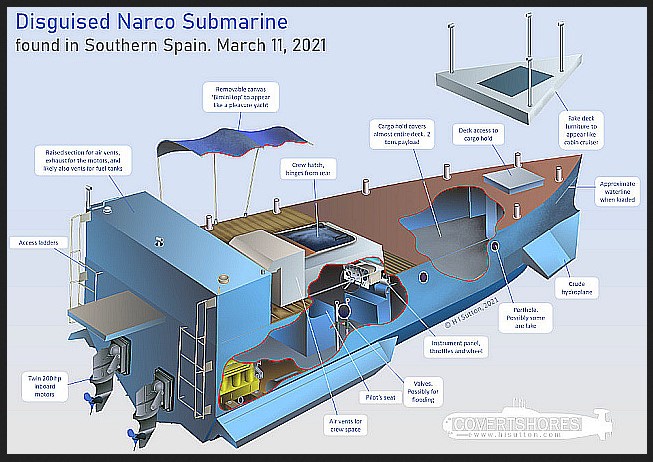 ※ どうも、画像を見る限りでは、監視の目を欺くため、海水面上に「甲板」を見せてはいるが、実は、それは偽装で、海水面下に「潜没」している部分があって、その船腹に「麻薬」や乗員を、隠している…、という形態のものであるようだ…。