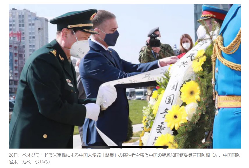 26日、ベオグラードで米軍機による中国大使館「誤爆」の犠牲者を弔う中国の魏鳳和国務委員兼国防相(左、中国国防省ホームページから)