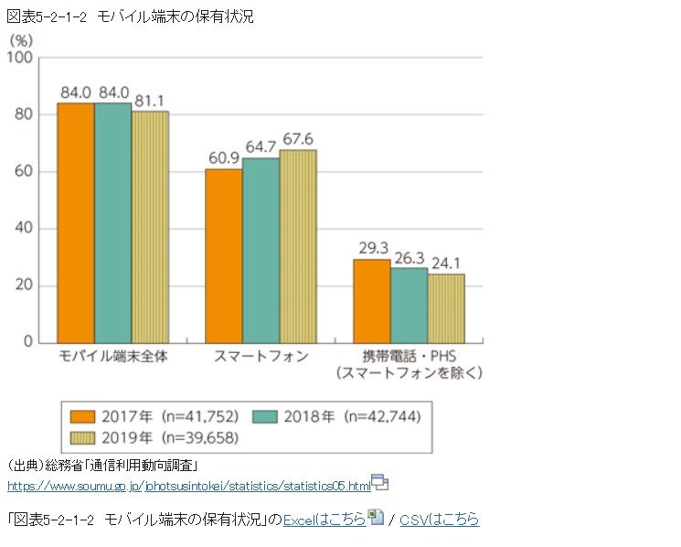 ●個人におけるスマートフォンの保有率は67.6%となっている。2019年における個人のモバイル端末の保有状況を見ると、「スマートフォン」の保有者の割合が67.6%となっており、「携帯電話・PHS」(24.1%)よりも43.5ポイント高くなっている。(図表5-2-1-2)。』