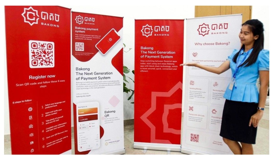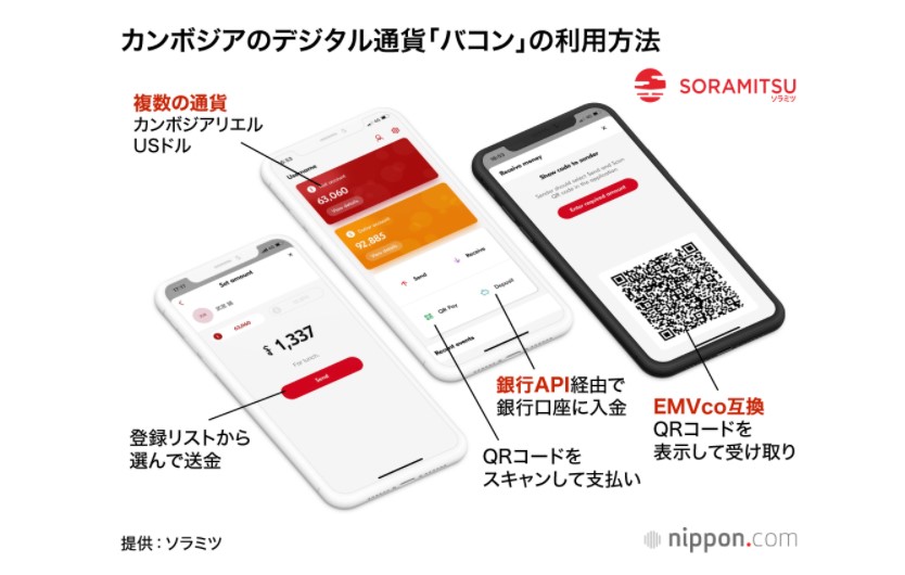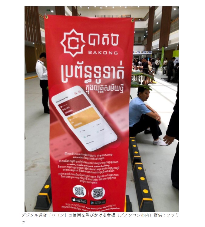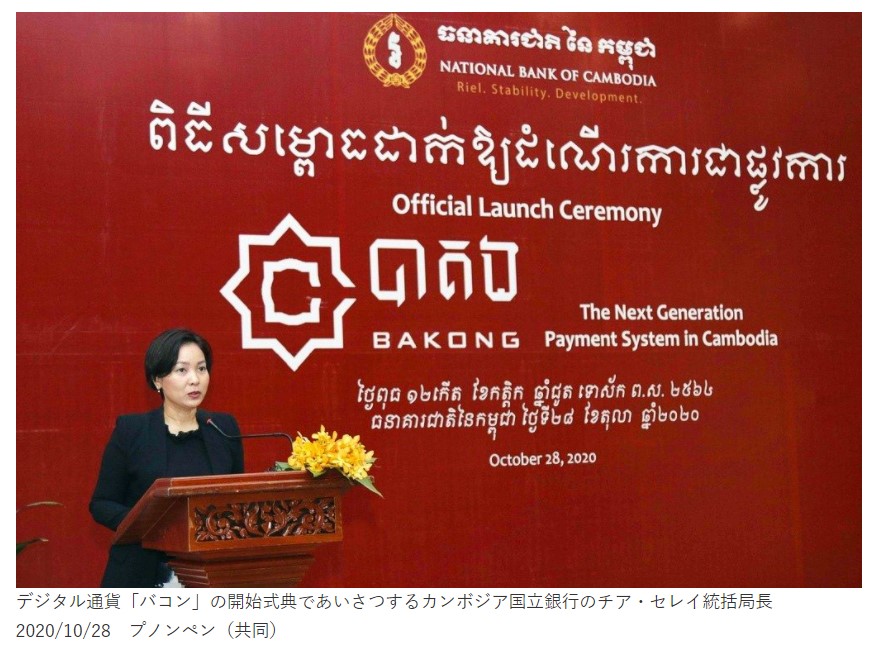 バナー写真:カンボジアのデジタル通貨「バコン」を紹介する展示物 プノンペン 2020/10/28 共同 』
