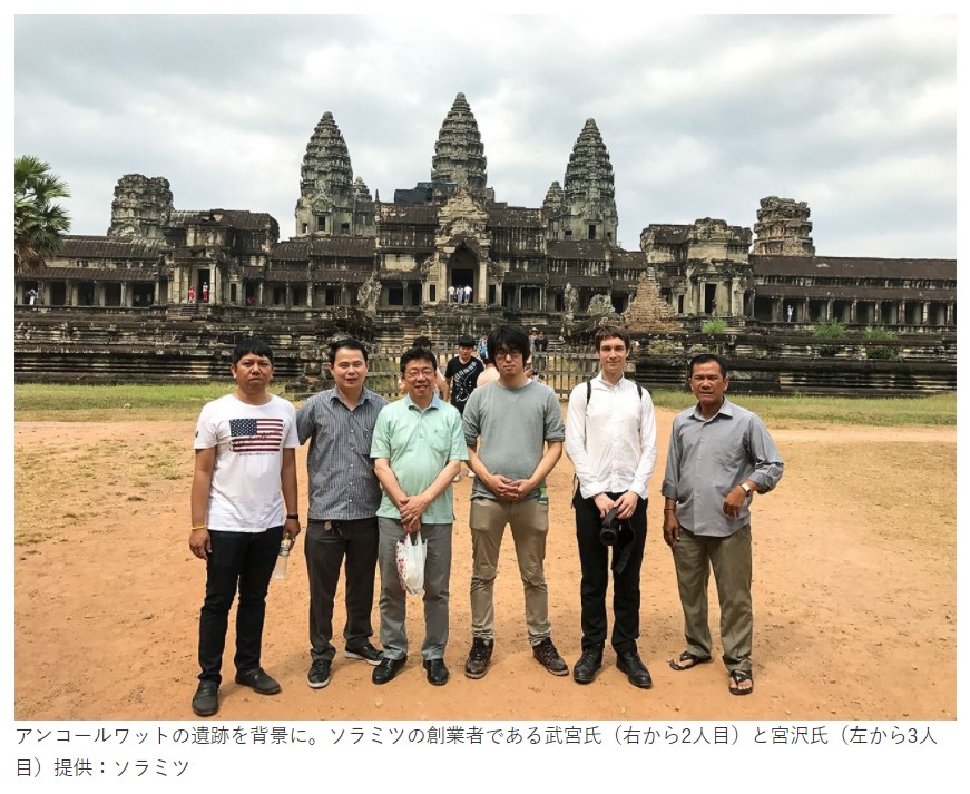 アンコールワットの遺跡を背景に。ソラミツの創業者である武宮氏(右から2人目)と宮沢氏(左から3人目)提供:ソラミツ