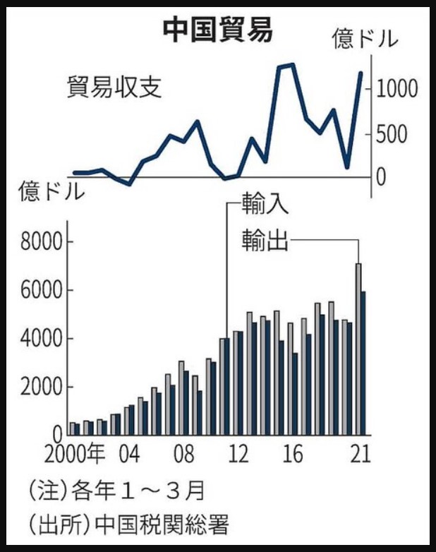 『中国税関総署が2021年4月13日発表した2021年1~3月の貿易統計(ドル建て)によると、過去の1~3月と比べて輸出入ともに過去最高となった。輸出はマスクやパソコン、ワクチンなど新型コロナウイルス関連がけん引した。輸入は資源のほか化粧品など最終製品も伸びた。新型コロナの打撃で落ち込んだ世界貿易の復調ぶりを映している。輸出は前年同期比49%増の7099億ドル(約77兆円)、輸入は28%増の5936億ドルだった。輸出から輸入を差し引いた貿易黒字は1163億ドルとなり、新型コロナの感染拡大で輸出が急減した前年の9倍に膨らんだ。