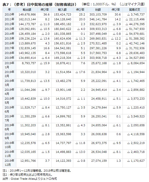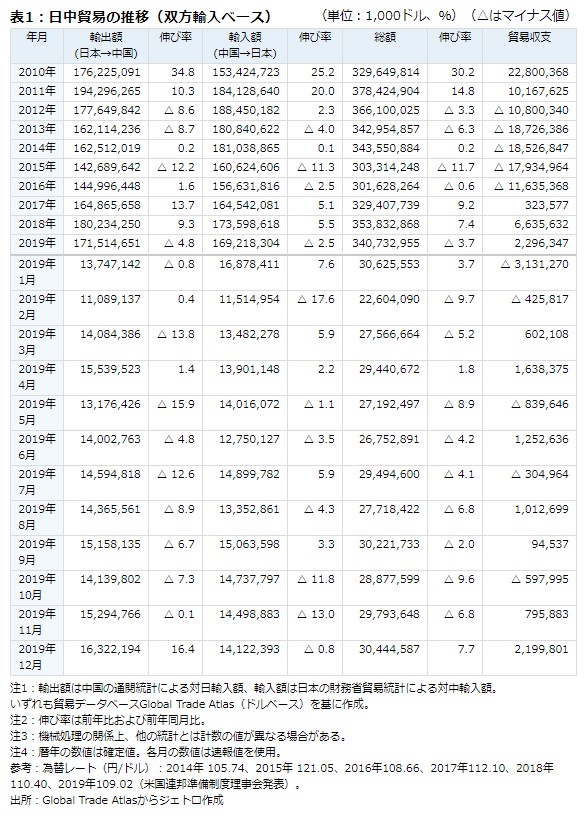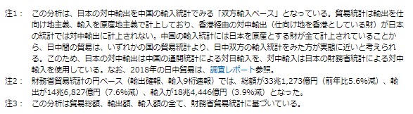 この分析は、日本の対中輸出を中国の輸入統計でみる「双方輸入ベース」となっている。貿易統計は輸出を仕向け地主義、輸入を原産地主義で計上しており、香港経由の対中輸出(仕向け地を香港としている財)が日本の統計では対中輸出に計上されない。中国の輸入統計には日本を原産とする財が全て計上されていることから、日中間の貿易は、いずれかの国の貿易統計より、日中双方の輸入統計をみた方が実態に近いと考えられる。このため、日本の対中輸出は中国の通関統計による対日輸入を、対中輸入は日本の財務省統計による対中輸入を使用している。なお、2018年の日中貿易は、調査レポート参照。