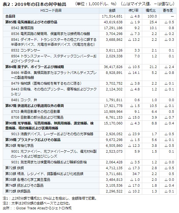 表2:2019年の日本の対中輸出(単位:1,000ドル、%)(△はマイナス値、-は値なし)