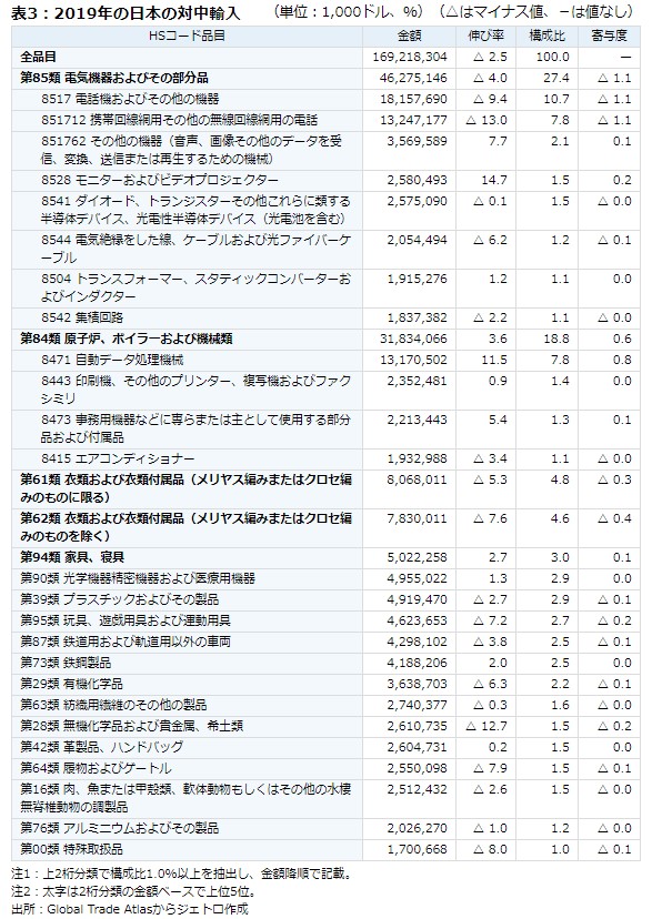 表3:2019年の日本の対中輸入(単位:1,000ドル、%)(△はマイナス値、-は値なし)