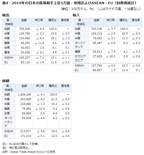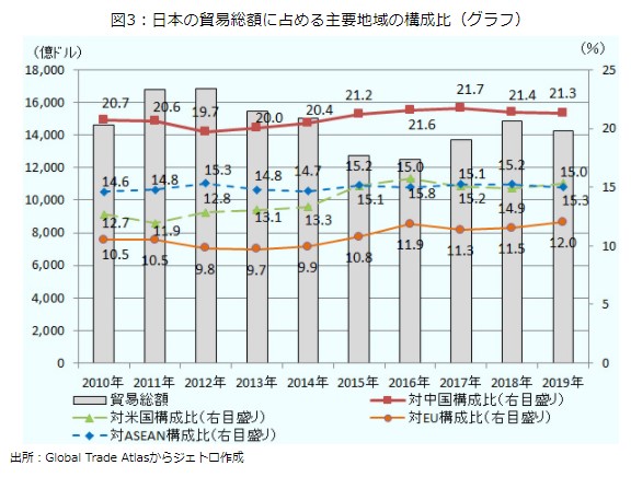 日本の貿易総額に占める主要地域の構成比は、 2010年 中国20.7 ASEAN14.6 米国12.7 EU10.5、 2011年 中国20.6 ASEAN14.8 米国11.9 EU10.5、 2012年 中国19.7 ASEAN15.3 米国12.8 EU9.8、 2013年 中国20.0 ASEAN14.8 米国13.1 EU9.7、 2014年中国20.4 ASEAN14.7 米国13.3 EU9.9、 2015年中国21.2 ASEAN15.2 米国15.1 EU10.8、 2016年 中国21.6 ASEAN15.0米国15.8 EU11.9、 2017年中国 21.7ASEAN15.1 米国15.2 EU11.3、 2018年中国21.4 米国14.9 ASEAN15.2 EU11.5、 2019年中国21.3 米国15.3 ASEAN15.0 EU12.0 だった。 この間の日本の貿易総額は2010年1兆4643億ドル、2011年1兆6796億ドル、2012年1兆6843億ドル 、2013年1億5475億ドル、2014年1兆5038億ドル、2015年1兆2730億ドル、2016年1兆2528億ドル、2017年1兆3704億ドル、2018年1兆4866億ドル、2019年1兆4263億ドル だった。