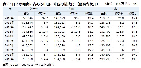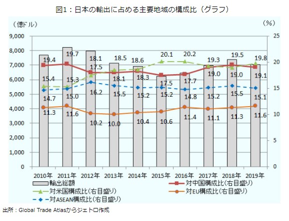 日本の輸出に占める主要地域の構成比は、 2010年 中国19.4 米国15.4 ASEAN14.7 EU11.3、 2011年 中国19.7 米国15.3 ASEAN15.0 EU11.6 、 2012年中国18.1 米国17.5 ASEAN16.2 EU10.2、 2013年米国18.5 中国18.1 ASEAN15.5 EU10.0、 2014年米国18.6 中国18.3 ASEAN15.2 EU10.4 、 2015年米国 20.1中国17.5 ASEAN15.2 EU10.6、 2016年 米国20.2 中国17.7 ASEAN14.8 EU11.4、 2017年米国19.3 中国19.0 ASEAN15.2 EU11.1、 2018年中国19.5 米国19.0 ASEAN15.5 EU11.3、 2019年米国19.8、中国19.1 ASEAN15.1 EU11.6だった。この間の日本の輸出額は、2010年 7,700億ドル、2011年 8,235億ドル、2012年 7,984億ドル、2013年 7,149億ドル、2014年 6,908億ドル、 2015年 6,249億ドル、2016年 6,451億ドル、2017年 6,983億ドル、2018年 7,381億ドル、2019年 7,055億ドルであった。