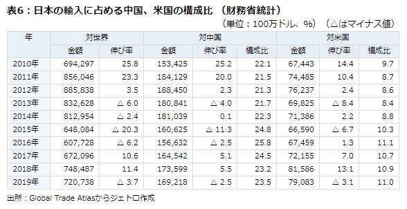 表6:日本の輸入に占める中国、米国の構成比 (財務省統計)(単位:100万ドル、%)(△はマイナス値)