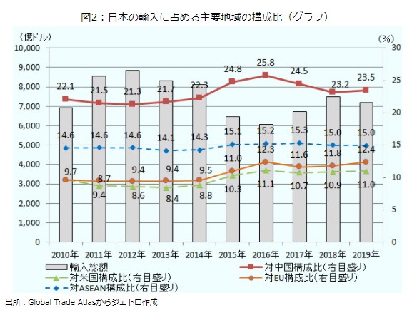 日本の輸入に占める主要地域の構成比は、 2010年 中国22.1 米国9.7 ASEAN14.6 EU9.6、 2011年 中国21.5 米国8.7 ASEAN14.6 EU9.4、 2012年中国21.3 米国8.6 ASEAN14.6 EU9.4、 2013年中国21.7 米国8.4 ASEAN14.1EU9.4、 2014年中国22.3 米国8.8 ASEAN14.3 EU9.5、 2015年中国24.8 米国10.3 ASEAN15.1EU11.0、 2016年中国25.8 中国11.1 ASEAN15.2 EU12.3、 2017年中国24.5 米国10.7ASEAN15.3 EU11.6、 2018年中国23.2 米国10.9 ASEAN15.0 EU11.8、 2019年中国23.5、中国11.0 ASEAN15.0 EU12.4だった。 この間の日本の輸入総額は、2010年6943億ドル、2011年 8560億ドル、2012年8858億ドル、2013年8326億ドル、2014年8130億ドル、2015年6481億ドル、2016年6077億ドル、 2017年6721億ドル、2018年7485億ドル、2019年7207億ドルだった。