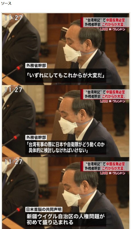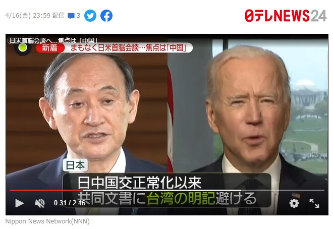 『日米首脳の共同声明に「台湾」が明記された。中国の台頭に強い危機感を抱く米国に引きずられるように、日本が足並みをそろえるとのメッセージを発信する形になった。人権侵害に示した「懸念」を含め、中国側は猛反発しており、関係諸国に与える今後の影響は、見通せない。