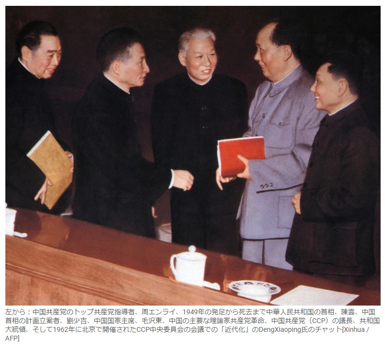 左から:中国共産党のトップ共産党指導者、周エンライ、1949年の発足から死去まで中華人民共和国の首相、陳雲、中国首相の計画立案者、劉少吉、中国国家主席、毛沢東、中国の主要な理論家共産党革命、中国共産党(CCP)の議長、共和国大統領、そして1962年に北京で開催されたCCP中央委員会の会議での「近代化」のDengXiaoping氏のチャット[Xinhua / AFP]