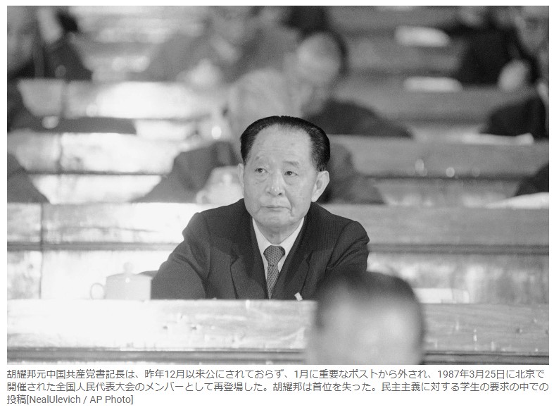胡耀邦元中国共産党書記長は、昨年12月以来公にされておらず、1月に重要なポストから外され、1987年3月25日に北京で開催された全国人民代表大会のメンバーとして再登場した。胡耀邦は首位を失った。民主主義に対する学生の要求の中での投稿[NealUlevich / AP Photo]