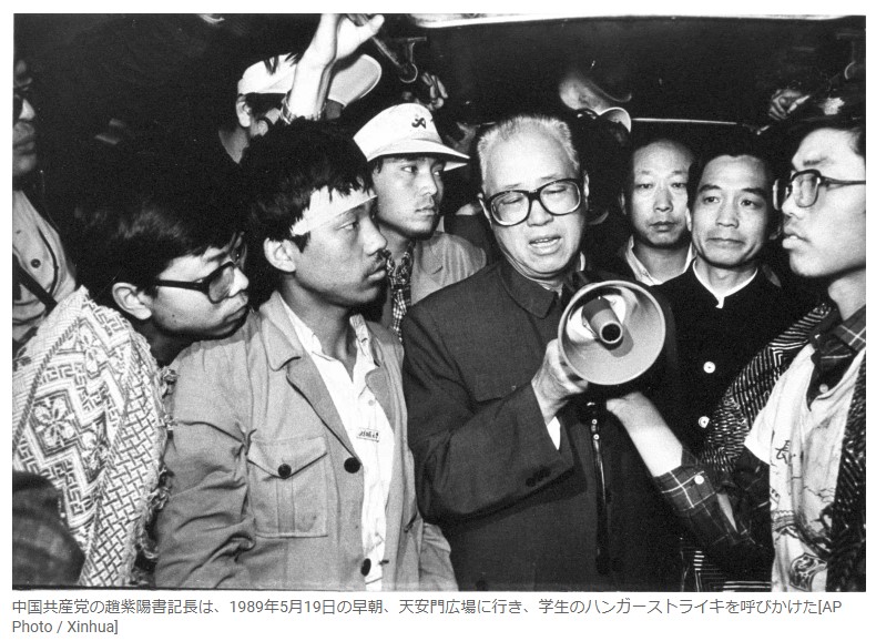 中国共産党の趙紫陽書記長は、1989年5月19日の早朝、天安門広場に行き、学生のハンガーストライキを呼びかけた[AP Photo / Xinhua]