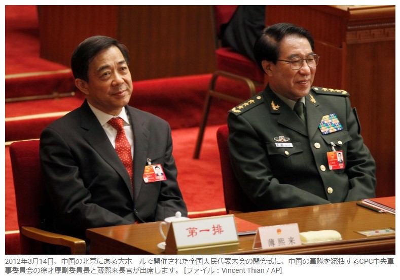 2012年3月14日、中国の北京にある大ホールで開催された全国人民代表大会の閉会式に、中国の軍隊を統括するCPC中央軍事委員会の徐才厚副委員長と薄熙来長官が出席します。 [ファイル:Vincent Thian / AP]