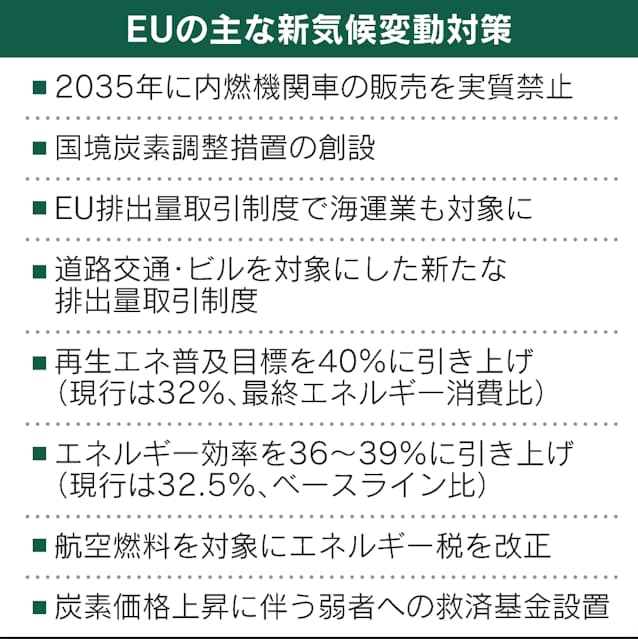 欧州委の政策パッケージは、30年までに域内の温暖化ガスの排出量を1990年比55%減らす目標を実現するための対策だ。2030年目標は50年に排出実質ゼロにする目標の中間点となる。フォンデアライエン欧州委員長は14日の記者会見で「化石燃料に依存する経済は限界に達した」と述べ、速やかに脱炭素社会を実現すると表明した。