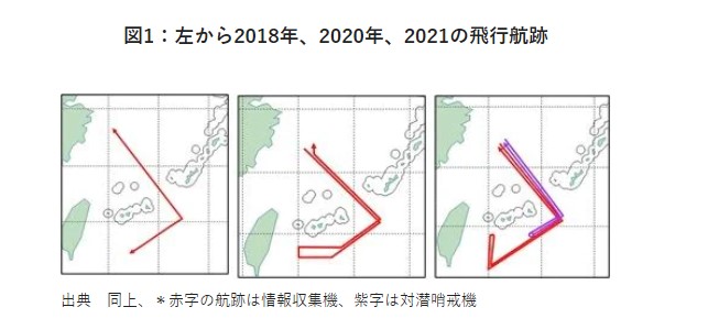 中国空軍の情報収集機や対潜哨戒機が、宮古海峡を通過して日本の先島諸島(宮古島・石垣島・西表島・与那国島など)の南側に回り込んで接近し、自衛隊の軍事情報を収集している。