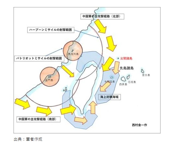 中国が奇襲侵攻するのであれば、これらのミサイルの射撃を回避するために、その射程外を迂回して、台湾本島を攻撃しなければならない。