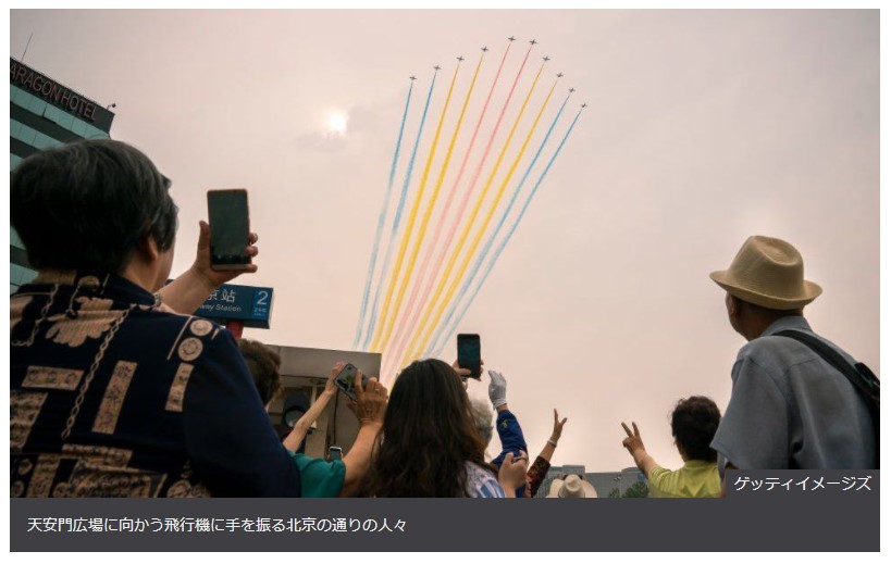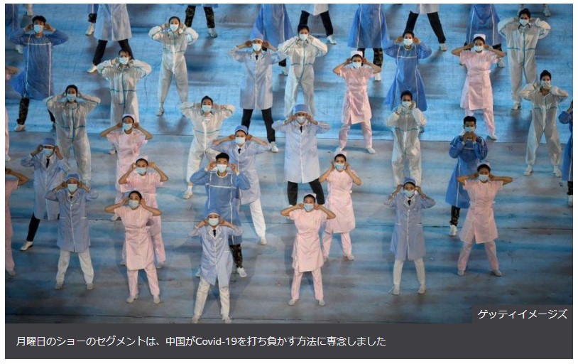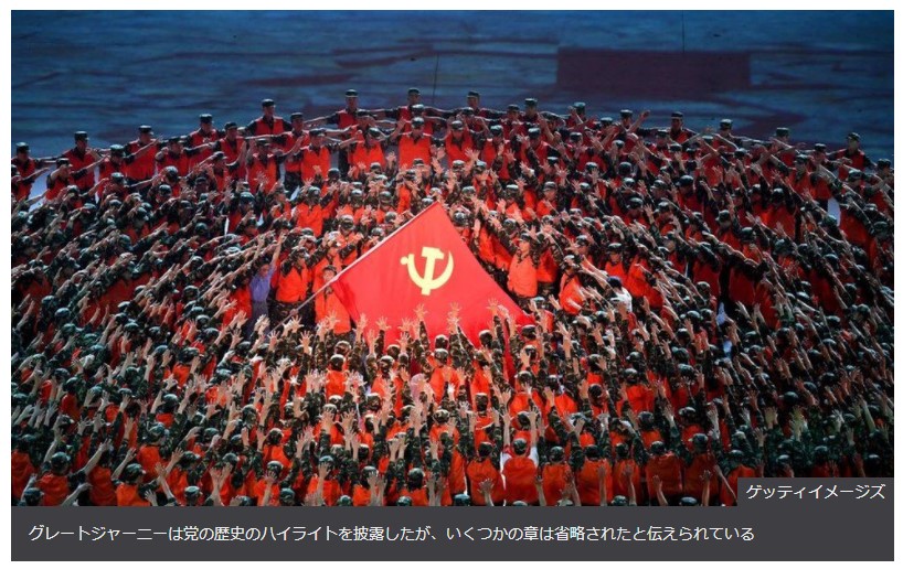メッセージが大声ではっきりと出て行ったことを確認するために、式典の最後に、群衆は「共産党がなければ新しい中国はないだろう」という歌を歌いまし』