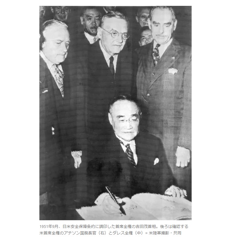 1951年9月、日米安全保障条約に調印した首席全権の吉田茂首相。後ろは確認する米首席全権のアチソン国務長官(右)とダレス全権(中)= 米陸軍撮影・共同