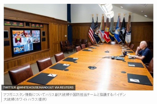 アフガニスタン情勢についてハリス副大統領や国防担当チームと協議するバイデン大統領(ホワイトハウス提供)