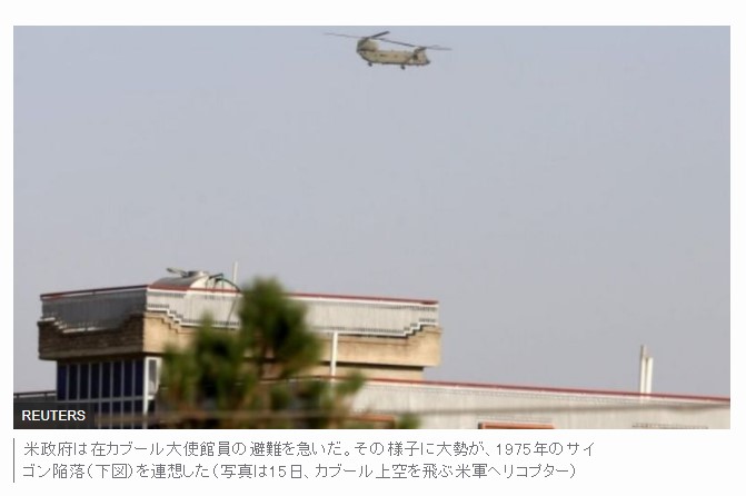 米政府は在カブール大使館員の避難を急いだ。その様子に大勢が、1975年のサイゴン陥落(下図)を連想した(写真は15日、カブール上空を飛ぶ米軍ヘリコプター)