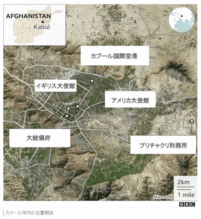 タリバンが首都を包囲してから数時間のうちに、カブールのカルザイ国際空港は民間機の発着を停止した。カブール郊外にある国内最大の刑務所でも、警備していた治安部隊はタリバンに降伏した。