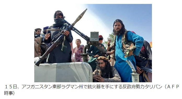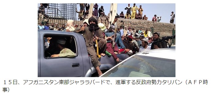 『15日、アフガニスタンの反政府武装勢力タリバンが首都カブールの大統領府を掌握し、政権を奪取した。ガニ大統領は外国に脱出している。この混沌とした政変を、中国共産党の機関紙『人民日報』傘下の『環球時報』は「平和的な政権移行」を強調し、タリバン支配のアフガンに「落ち着いたら一帯一路への参加」の可能性を示唆した。