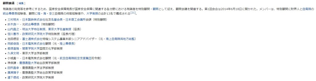 国家安全保障会議 (日本)https://ja.wikipedia.org/wiki/%E5%9B%BD%E5%AE%B6%E5%AE%89%E5%85%A8%E4%BF%9D%E9%9A%9C%E4%BC%9A%E8%AD%B0_(%E6%97%A5%E6%9C%AC)