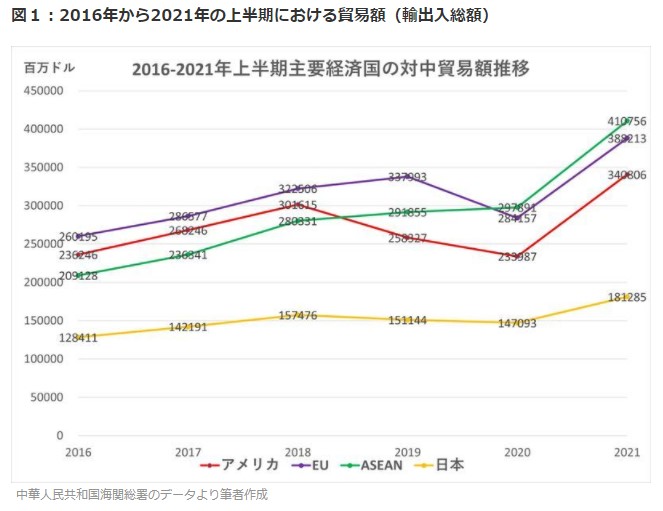 中華人民共和国海関総署のデータより筆者作成 ここででは比較対象国・地域として「アメリカ、EU、ASEAN、日本」を選んでみた。暦年データで上半期に絞ったのは、7月13日に発表されたデータが上半期だけのものなので、比較を公平にするためだ。