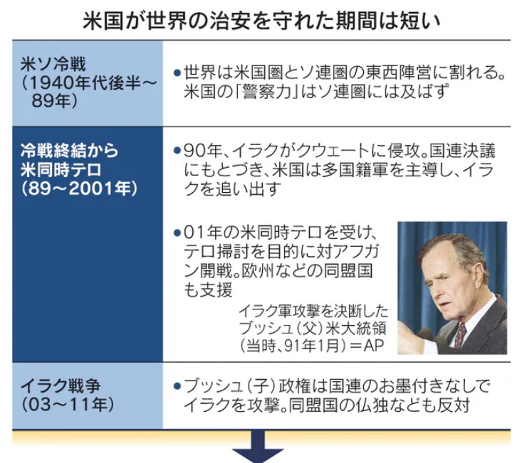 これに先立つ1940年代後半~89年、世界は米ソ冷戦で東西陣営に分かれ、米国の「警察力」が及んだのは西側だけだった。