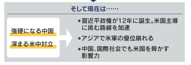 そこに中国の台頭が追い打ちをかける。とりわけ、習近平(シー・ジンピン)氏が共産党総書記についた12年以降、中国は強硬路線にまい進し、米国主導の秩序に正面から挑みだした。