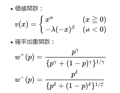 後にプロスペクト理論は、「累積プロスペクト理論」として拡張された。カーネマンはそこで、価値関数と確率加重関数の式を以下のように特定している。