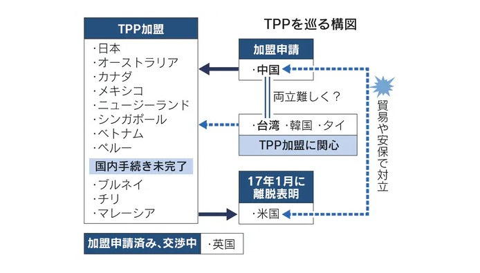 現在加盟する11カ国の実質国内総生産(GDP)は世界の1割超で、中国が加わると3割になる。安全保障上の中国の脅威が高まる中、加盟国は単純に経済の観点で判断できない状況になっている。(江渕智弘、北京=川手伊織、ワシントン=鳳山太成)