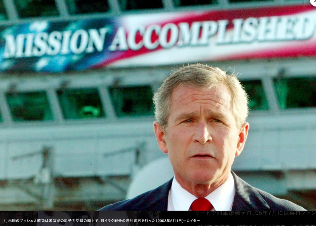 『1, 米国のブッシュ大統領は米海軍の原子力空母の艦上で、対イラク戦争の勝利宣言を行った(2003年5月1日)=ロイター