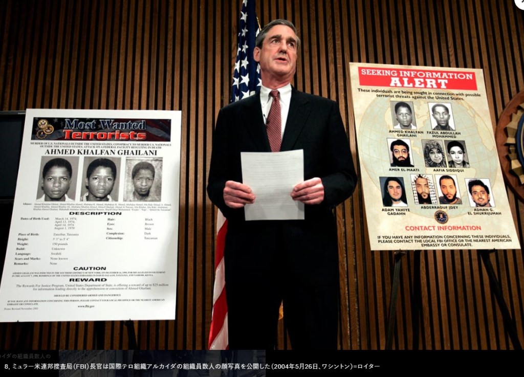 8, ミュラー米連邦捜査局(FBI)長官は国際テロ組織アルカイダの組織員数人の顔写真を公開した(2004年5月26日、ワシントン)=ロイター