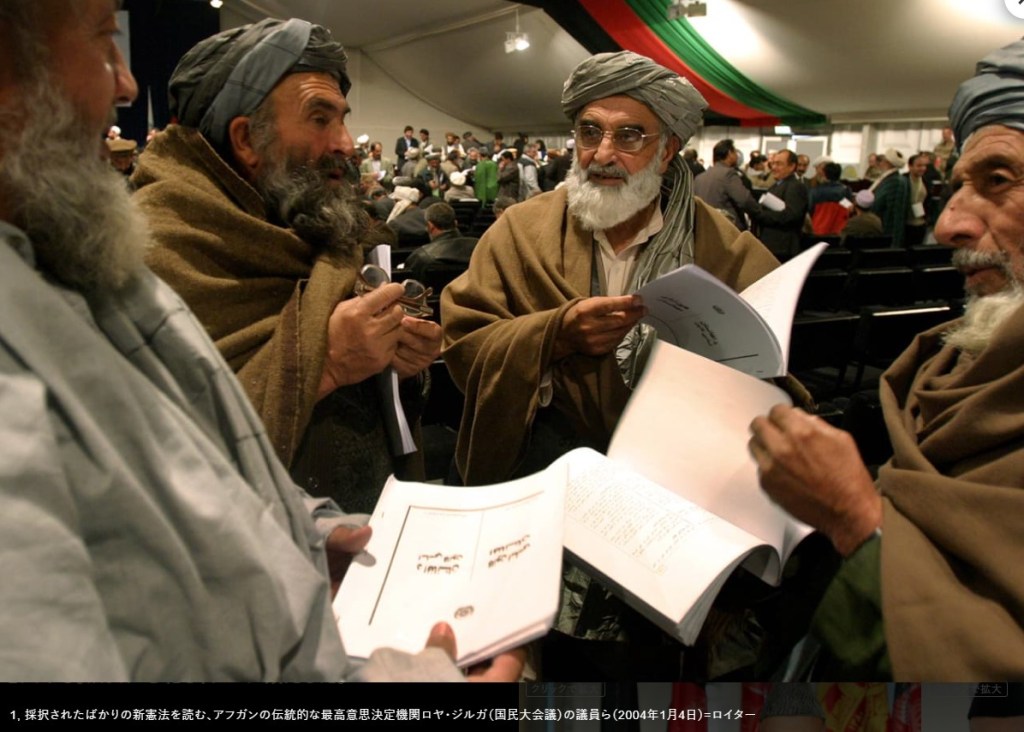 『1, 採択されたばかりの新憲法を読む、アフガンの伝統的な最高意思決定機関ロヤ・ジルガ(国民大会議)の議員ら(2004年1月4日)=ロイター