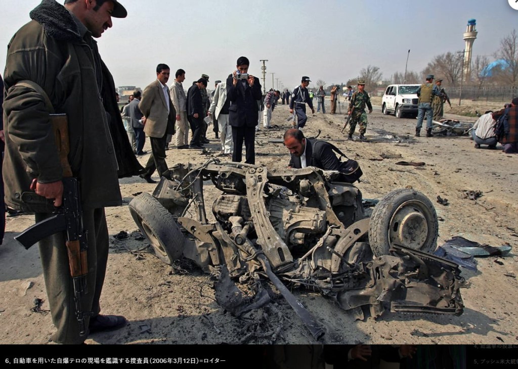 6, 自動車を用いた自爆テロの現場を鑑識する捜査員(2006年3月12日)=ロイター