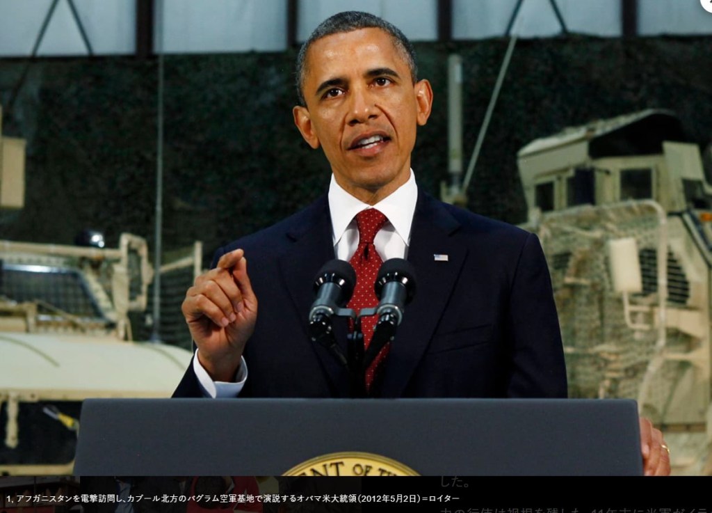 『1, アフガニスタンを電撃訪問し、カブール北方のバグラム空軍基地で演説するオバマ米大統領(2012年5月2日)=ロイター