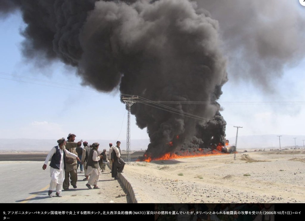 9, アフガニスタン・パキスタン国境地帯で炎上する燃料タンク。北大西洋条約機構(NATO)軍向けの燃料を運んでいたが、タリバンとみられる戦闘員の攻撃を受けた(2006年10月1日)=ロイター