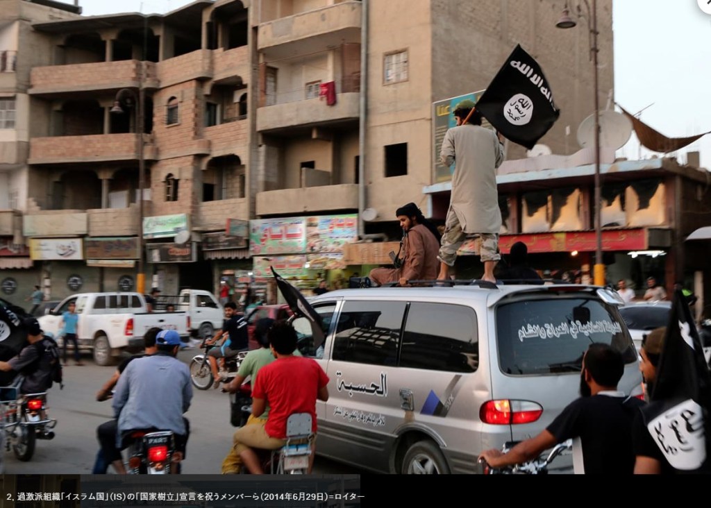 2, 過激派組織「イスラム国」(IS)の「国家樹立」宣言を祝うメンバーら(2014年6月29日)=ロイター