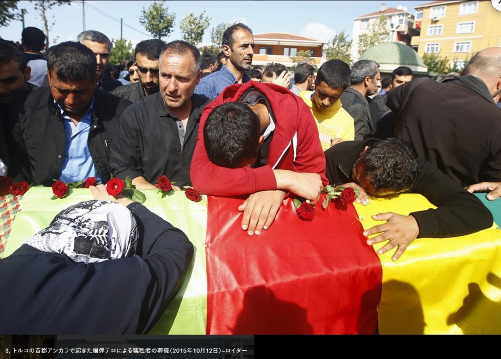 3, トルコの首都アンカラで起きた爆弾テロによる犠牲者の葬儀(2015年10月12日)=ロイター
