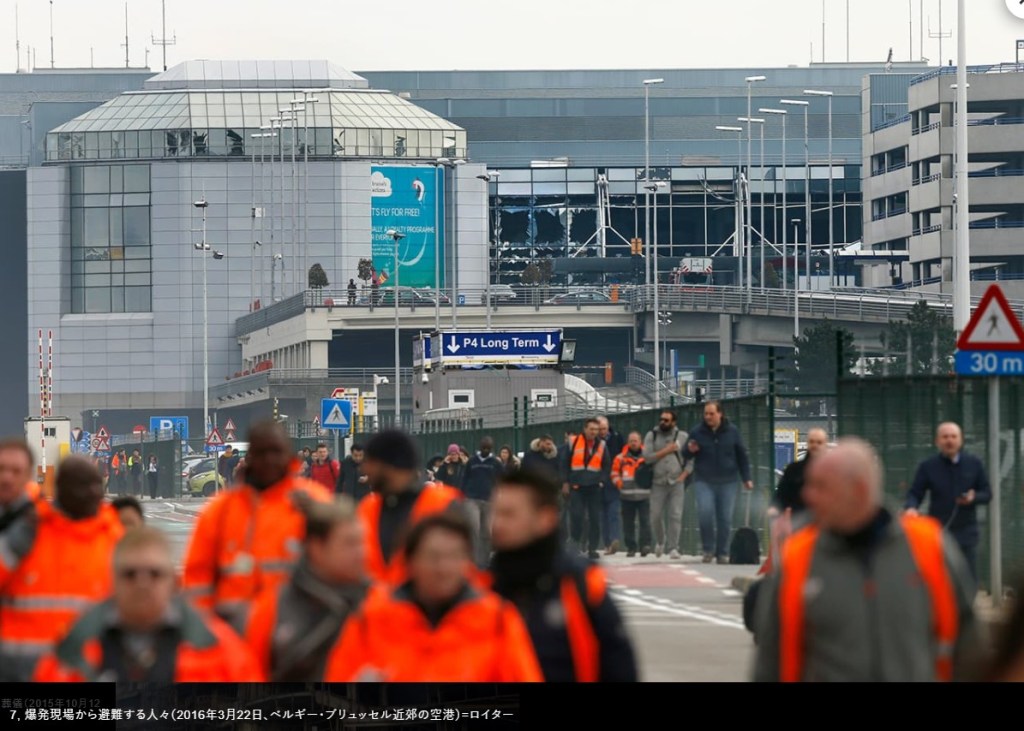 7, 爆発現場から避難する人々(2016年3月22日、ベルギー・ブリュッセル近郊の空港)=ロイター