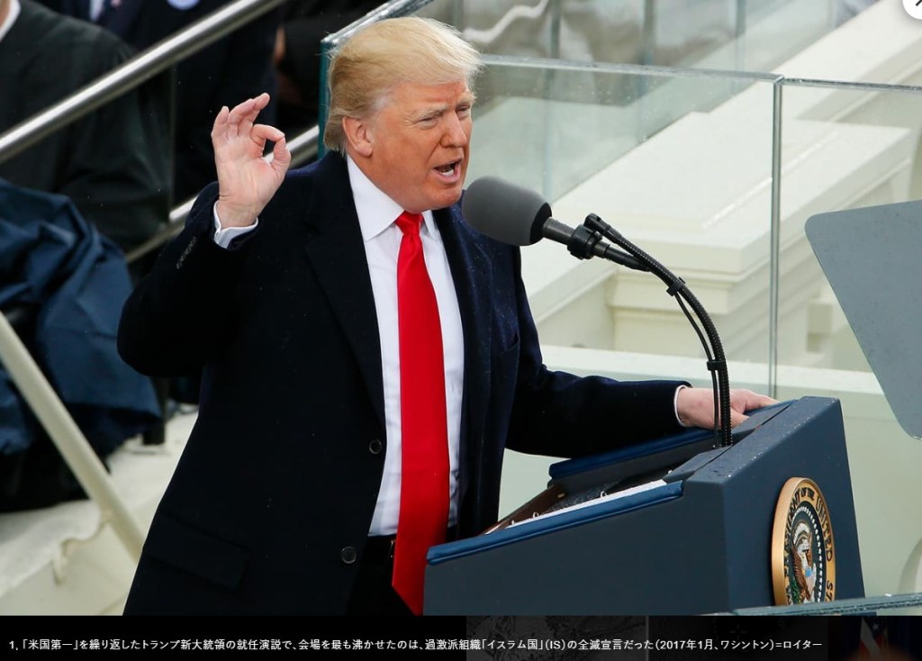 『1, 「米国第一」を繰り返したトランプ新大統領の就任演説で、会場を最も沸かせたのは、過激派組織「イスラム国」(IS)の全滅宣言だった(2017年1月、ワシントン)=ロイター