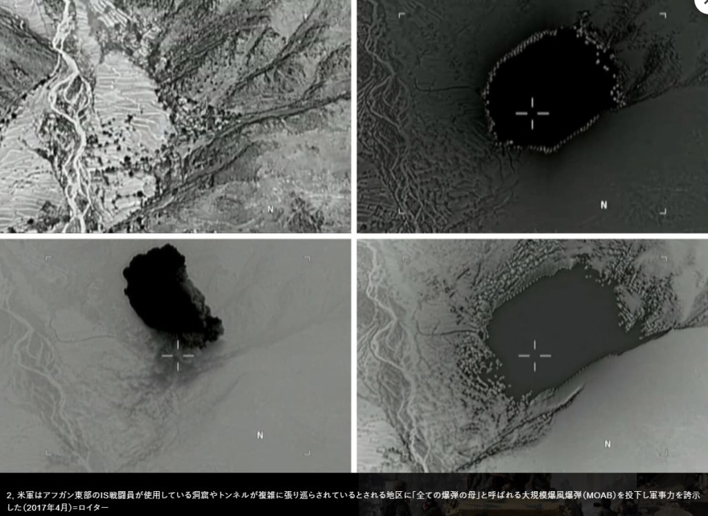 2, 米軍はアフガン東部のIS戦闘員が使用している洞窟やトンネルが複雑に張り巡らされているとされる地区に「全ての爆弾の母」と呼ばれる大規模爆風爆弾(MOAB)を投下し軍事力を誇示した(2017年4月)=ロイター